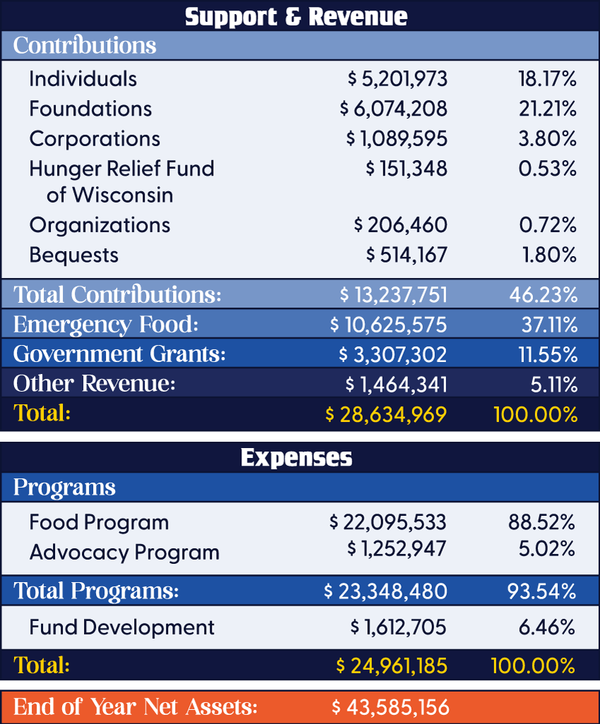 • Hosted the Hunger Relief Federation Summit for 115 attendees representing 61 organizations across 32 Wisconsin counties