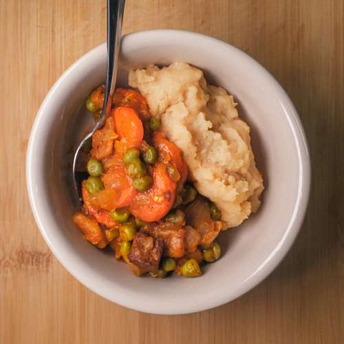For potato flakes: Bring 1.5 cups of beef broth or water to a boil. Remove from heat, stir in potato flakes, cover and let sit for 1-2 minutes. Fluff with a fork, then mix in a portion of your heated vegetable beef stew.